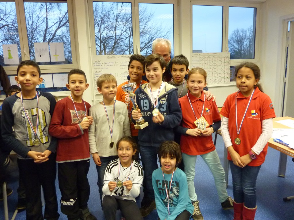 Collège Réné SCHIEKELE de Saint-Louis : son team avec trop de débutants avait fort à faire cet après-midi au collège les Ménétriers de Ribeauvillé. Déjà le costaud local échaudé par sa défaitte en 2014 présentait un team de rêve et a donc survolé le tournoi avec 18/18, mais pour la deuxième place qualificative pour la finale académique, tout s’est joué à la 48 ème et dernière partie des 6 matches entre Assomption Colmar et Schiekelé et malheureusement notre féminine au 7 avait le gain mais troublée sans doute par l’enjeu sportif s’est trompée dans ses manoeuvres de pièces et a commis l’erreur de mettre son Roi dans un réseau de mat imparable : 4-3 pour Assomption et dommage pour Schiekelé qui méritait la victoire. C’est le sport ! Bravo aux lauréats et merci aux collégiens et parents accompagnateurs mais aussi à la dynamique Direction du Collège qui a permis cette épopée qui restera dans bien de mémoires.
