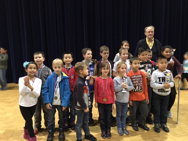 Au final, le club local ramasse 15 qualifiés sur 26 (58 %), ce qui fait de son école d’échecs la meilleure du département, un titre avec le favori des petits-poussins Telmen Baldandorj ( Widemann) qui lui aussi fait 7/7 , une vice-championne : la PPOF Monja Von Aescheraden ( Pagnol) qui avait gagné dernièrement le tournoi de sélection du club et 3 médailles de bronze : en poussins : le frère de Telmen , Teemulen Baldandorj ( Widemann ) en poussines, Nora Guimbaud ( Bourgfelden ) qui a longtemps mené le tournoi, et en PPOF la petite de 6 ans de l’école d’Hégenheim Natasha Foley future championne.