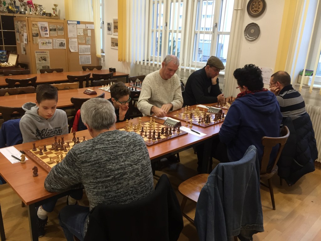 Nous avons reçu l’équipe, très sympathique, de Florival échecs ce matin dans nos murs pour la Coupe d’Alsace 2016/2017. Et c’est sans trop de problèmes que nous passons ce 1er tour sur le score de 3 à 0. Julie a rapidement gagné (mat en 13 coups) contre Schaeffer Denis (1280). C’est ensuite Clément qui s’impose, grâce à son expérience, sur le jeune Roellinger Cyril (1120) qui craque en finale, en lâchant beaucoup trop de pions. Les jeux étaient fait quand « Lolo » annule sa partie contre Fernandez Miguel (1717). Il semblait pourtant avoir en léger avantage positionnel, mais midi sonnait et la faim n’attendait plus ! Et pour finir, je gagne, après l’abandon en finale, de Cédric Roellinger (1060) qui s’est très bien défendu durant toute sa partie, m’obligeant, même, à réfléchir longtemps sur une position très compliquée. Je tiens à souligner l’exemplarité de l’équipe de Guebwiller et sa très grande gentillesse. Prochain tour en Coupe d’Alsace, le 5 février 2017. (Laurent)