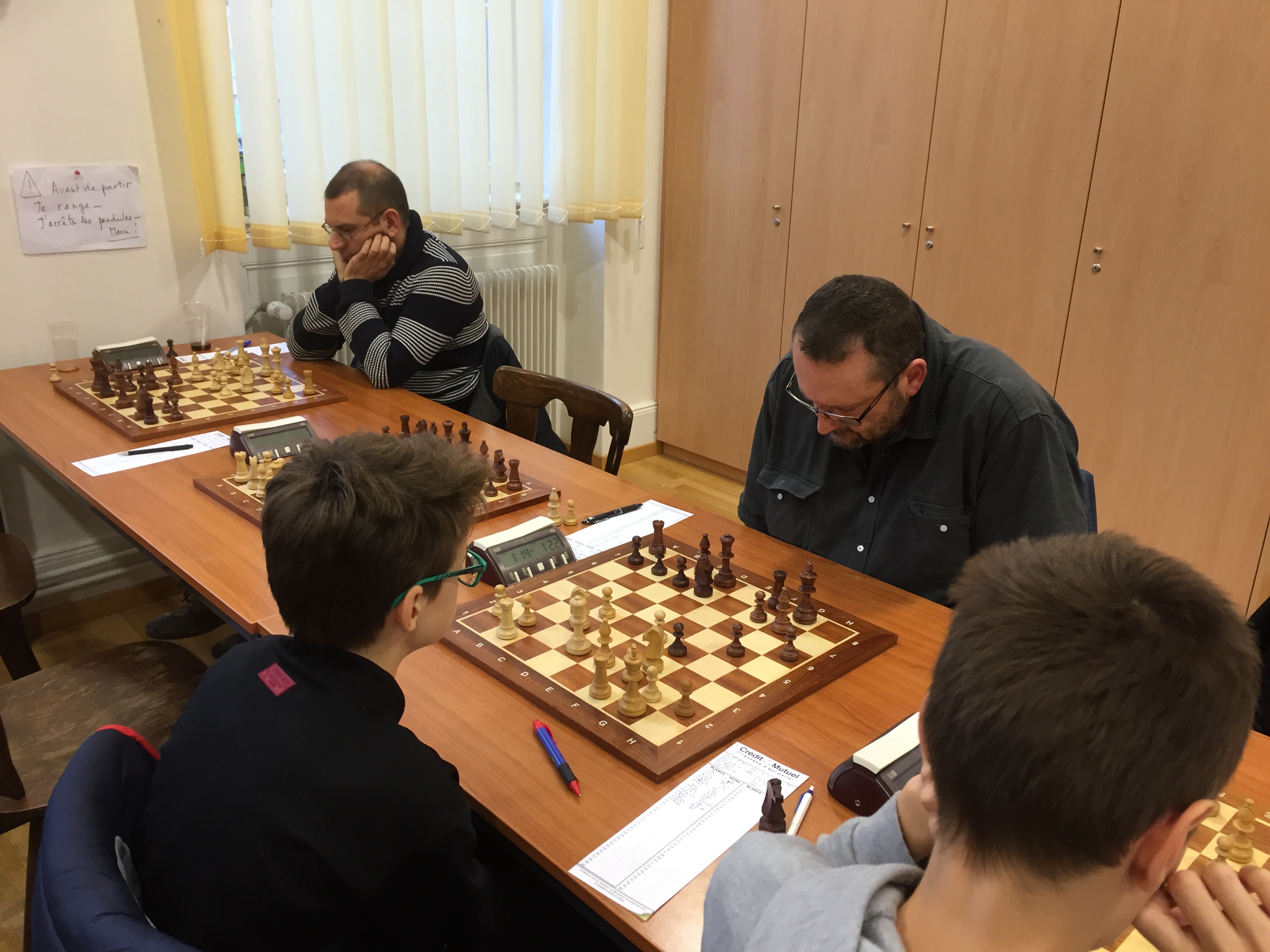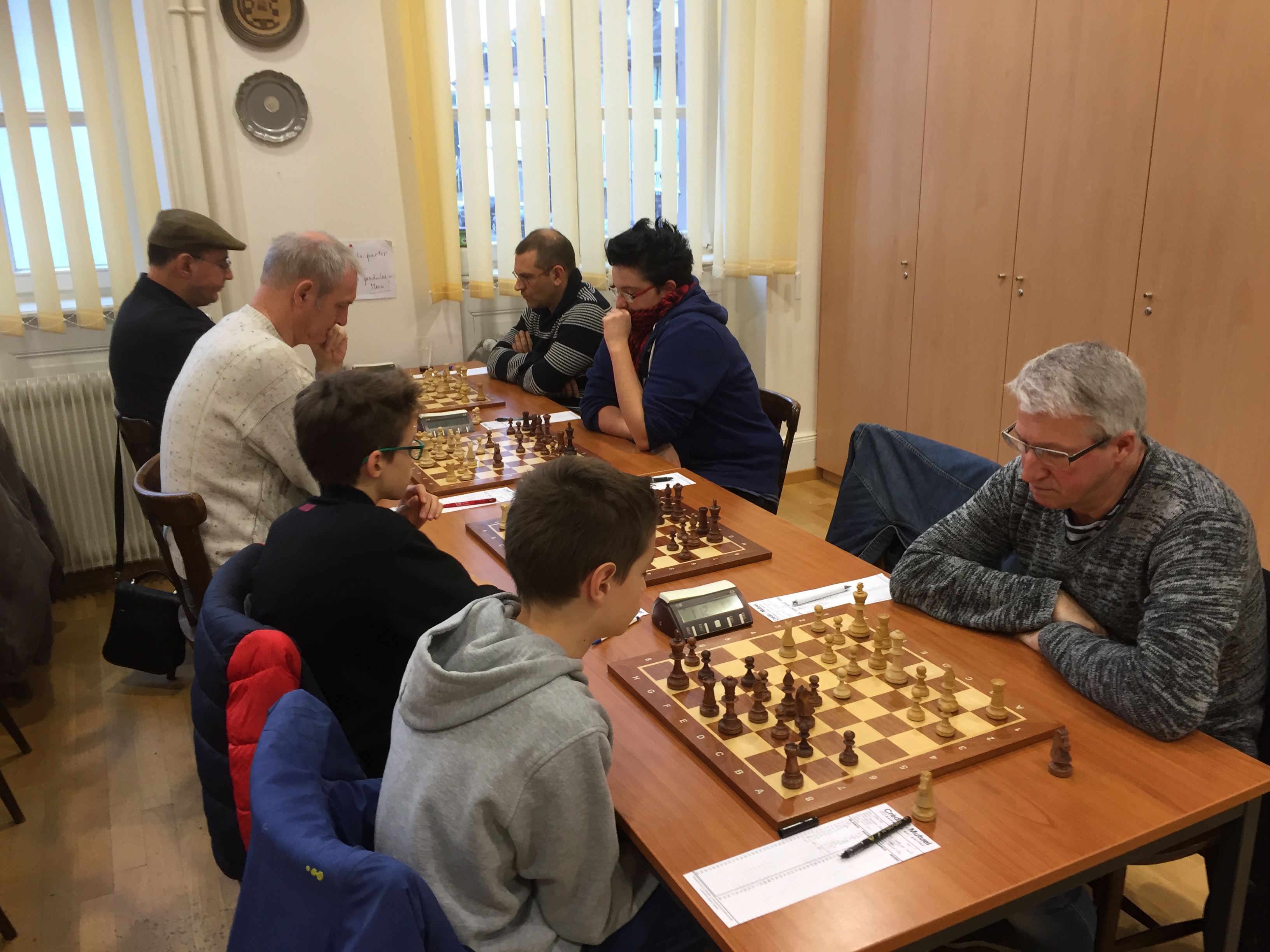 Nous avons reçu l’équipe, très sympathique, de Florival échecs ce matin dans nos murs pour la Coupe d’Alsace 2016/2017. Et c’est sans trop de problèmes que nous passons ce 1er tour sur le score de 3 à 0. Julie a rapidement gagné (mat en 13 coups) contre Schaeffer Denis (1280). C’est ensuite Clément qui s’impose, grâce à son expérience, sur le jeune Roellinger Cyril (1120) qui craque en finale, en lâchant beaucoup trop de pions. Les jeux étaient fait quand « Lolo » annule sa partie contre Fernandez Miguel (1717). Il semblait pourtant avoir en léger avantage positionnel, mais midi sonnait et la faim n’attendait plus ! Et pour finir, je gagne, après l’abandon en finale, de Cédric Roellinger (1060) qui s’est très bien défendu durant toute sa partie, m’obligeant, même, à réfléchir longtemps sur une position très compliquée. Je tiens à souligner l’exemplarité de l’équipe de Guebwiller et sa très grande gentillesse. Prochain tour en Coupe d’Alsace, le 5 février 2017. (Laurent)