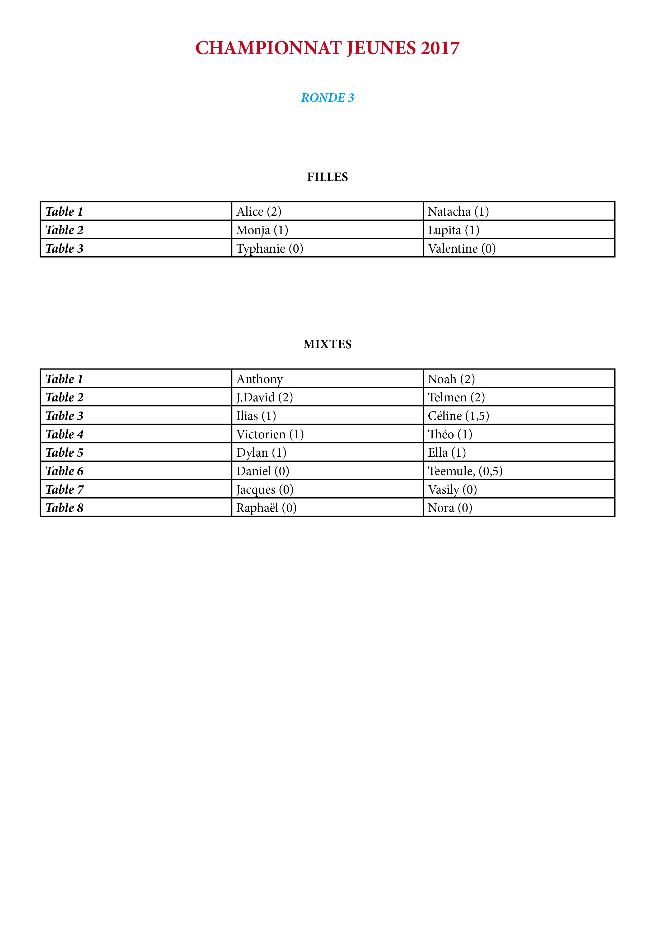 Pas de temps à perdre, samedi 7 janvier 2017, reprise du championnat jeunes 2017, ronde 3 à 9h45 au club de Huningue. Les rencontres seront arbitrées par Danielle. Veuillez noter les matchs suivants :