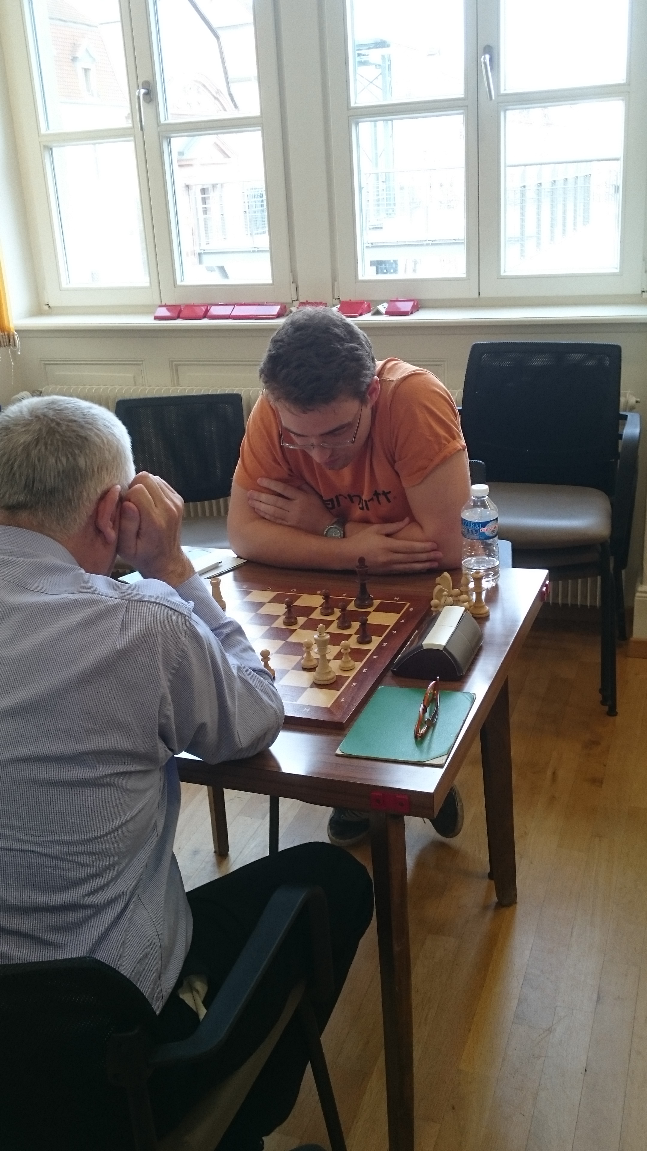 Nos adversaires très sympathiques et plus forts sur tous les échiquiers sauf les deux derniers commence par une victoire Un ancien du club et très fort joueurs Jean Paul Menetrey (1671) gagne contre moi. Dylan Foley (1087) perd une tour et donne le gain à son adversaire Kinnbacher Claude (1517), dur dur pour une première ! Suive une victoire de Ella et Théo assez facilement contre des débutants à 1009 d’élos.