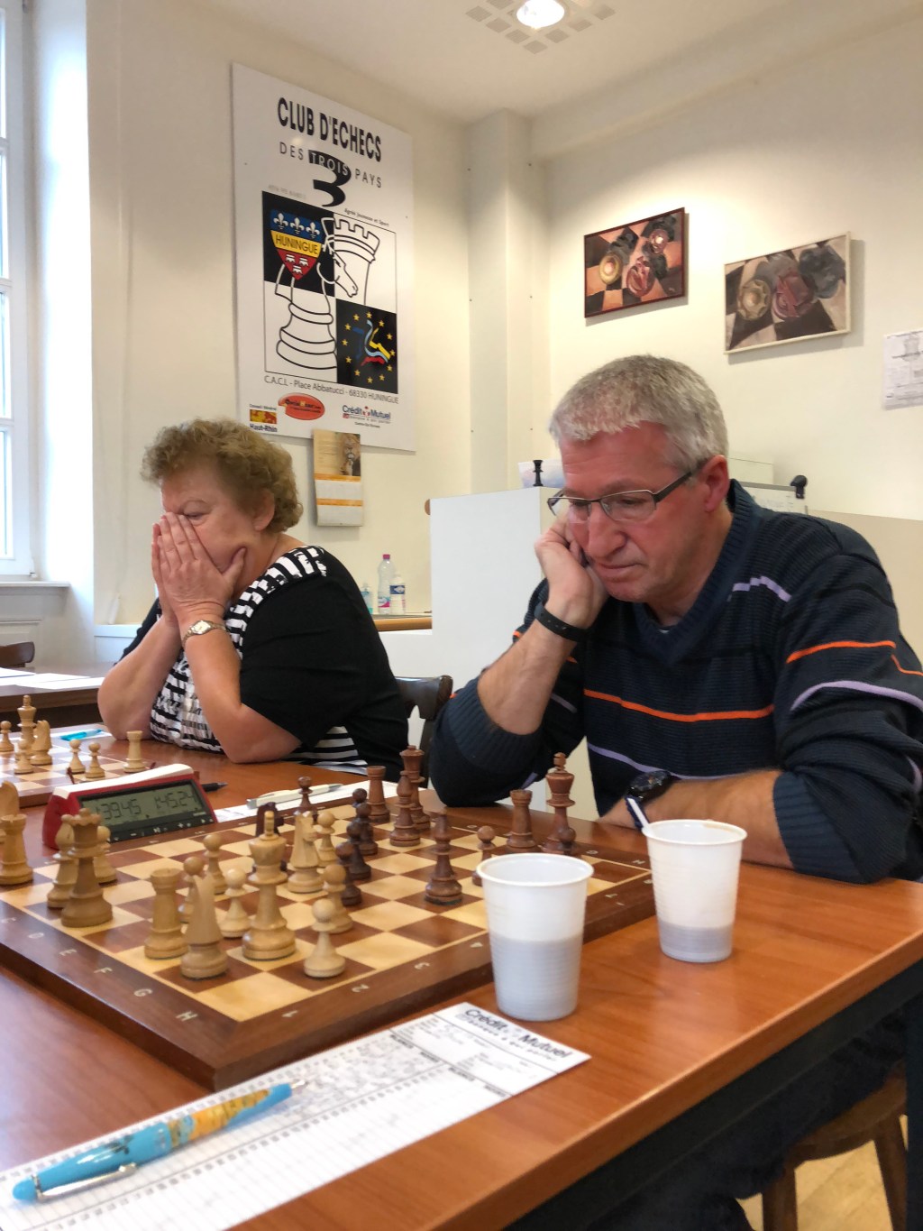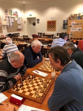 C’est « la » partie de la journée. Horst avec les Blancs essaie d’embrouiller François dans l’ouverture. En Blitz, cela aurait pu marcher. En partie lente, François demeure un joueur trop brillant pour s’en laisser compter. Il pare toutes les menaces, développe ses pièces avec harmonie et bientôt, lui-aussi, va montrer les crocs. Le Roi blanc tremble. Horst n’en croit pas ses yeux. Une longue bataille du centre s’engage ensuite. Les deux joueurs minent le terrain tour à tour. Attaque. Contre attaque. Les coups pleuvent. Bientôt le casque obligatoire aux échecs ? François prend un léger avantage positionnel. Pièces mieux placées. Aurait-il pu l’emporter ? Alors que le pendule commence à trembler, les deux joueurs se serrent la main. Nulle. Bravo aux deux ! Magnifique bataille !