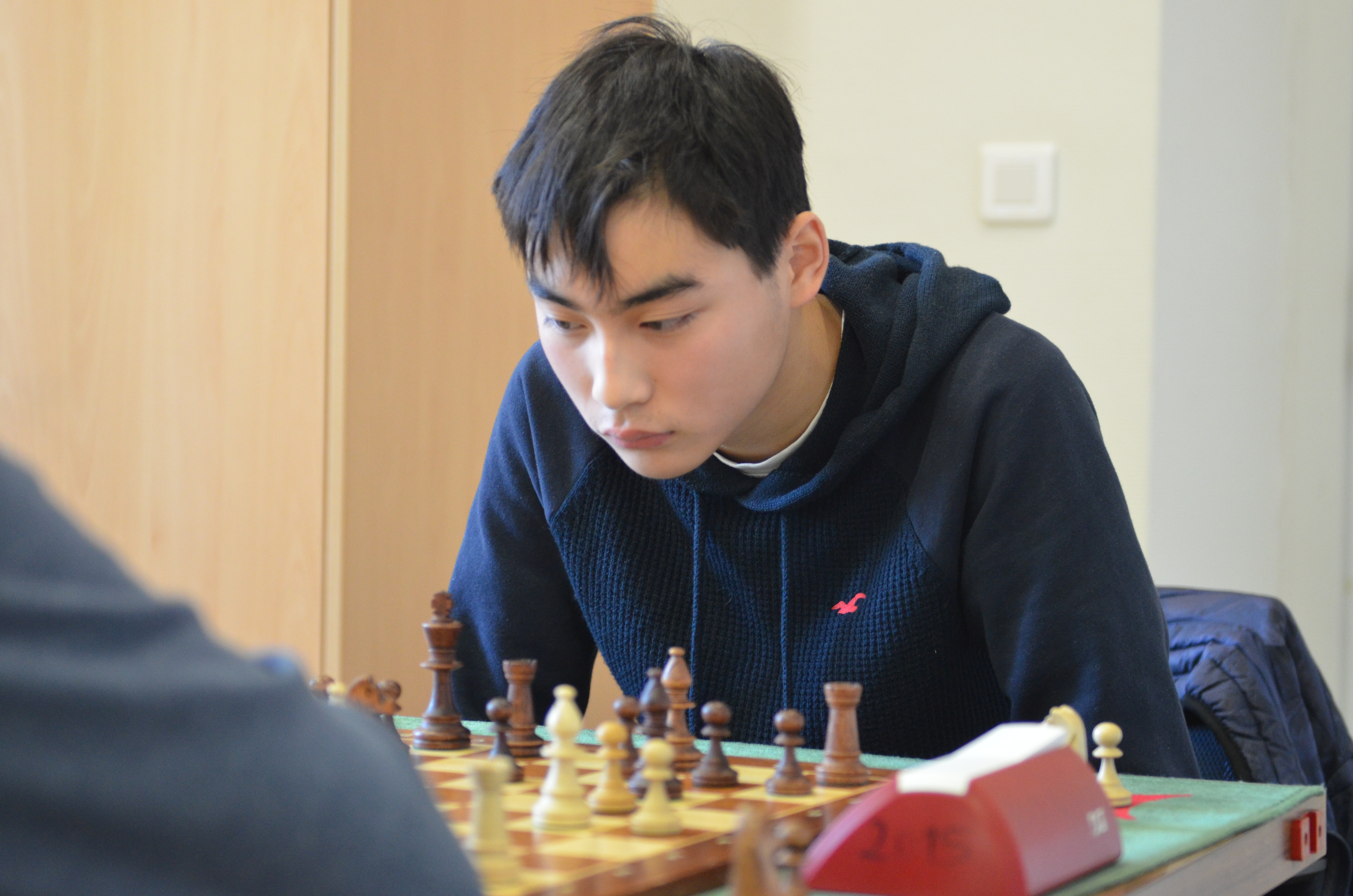 Au 3e échiquier, Karl-Christian stabilise tout d’abord le jeu au centre. Puis, il lance une attaque irrésistible et de toute beauté sur le roque. La défense adverse est aux abois et elle finit par craquer sous les coups de boutoirs. Victoire magnifique. 1-0.