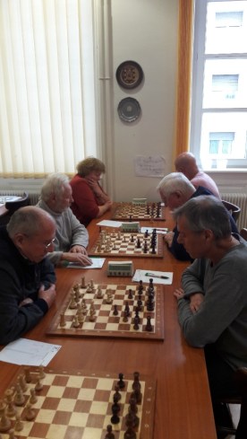 Une seule petite erreur, l’unique peut-être de toute la partie, va coûter la qualité et le demi-point sinon le point à François, irréprochable jusque là. Paul oppose une Hollandaise variante de Leningrad au 1.d4 de François. Les deux joueurs développent un jeu précis, millimétré. La partie tient l’équilibre. Le combat se déroule tout d’abord à l’aile Dame. François propose des échanges Dame et Cavalier. Paul les refuse. Il joue pour le gain. Déporte le jeu à l’aile Roi. Ouvre la colonne f. Attaque h2 avec Dh5 et Cg4…. Étonnante case que cette case g4… Chassé une première fois, au prix d’un affaiblissement du roque des blancs, c’est depuis cette même case que le même Cavalier noir assénera la fourchette Roi/Tour. Une fourchette décisive. Survenue en zeitnot il est vrai. Les Seniors ne joueront dorénavant plus en 1h KO, mais en 50′ + 30″…(Paul)